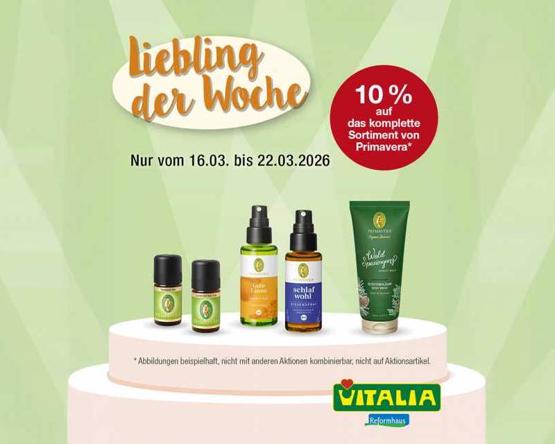 Vom 16. bis 22. März bekommt ihr 10 % Rabatt auf das gesamte Sortiment von PRIMAVERA. Verwöhnt euch mit den ätherischen Ölen von PRIMAVERA und taucht ein in wohltuende Duftwelten. Ob Raumsprays, Duftmischungen, Duft Roll-Ons oder Duschgels - mit den hochwertigen Produkten von PRIMAVERA könnt ihr euren Tag in eine duftende Wohlfühl-Oase verwandeln.