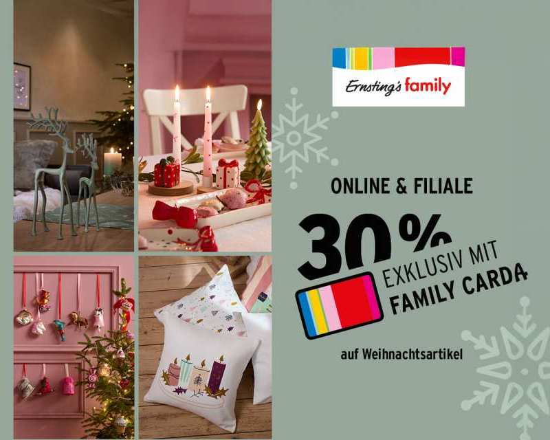 Bei Ernsting’s family gibt es 30 % Rabatt auf Weihnachtsartikel exklusiv mit Family Card.